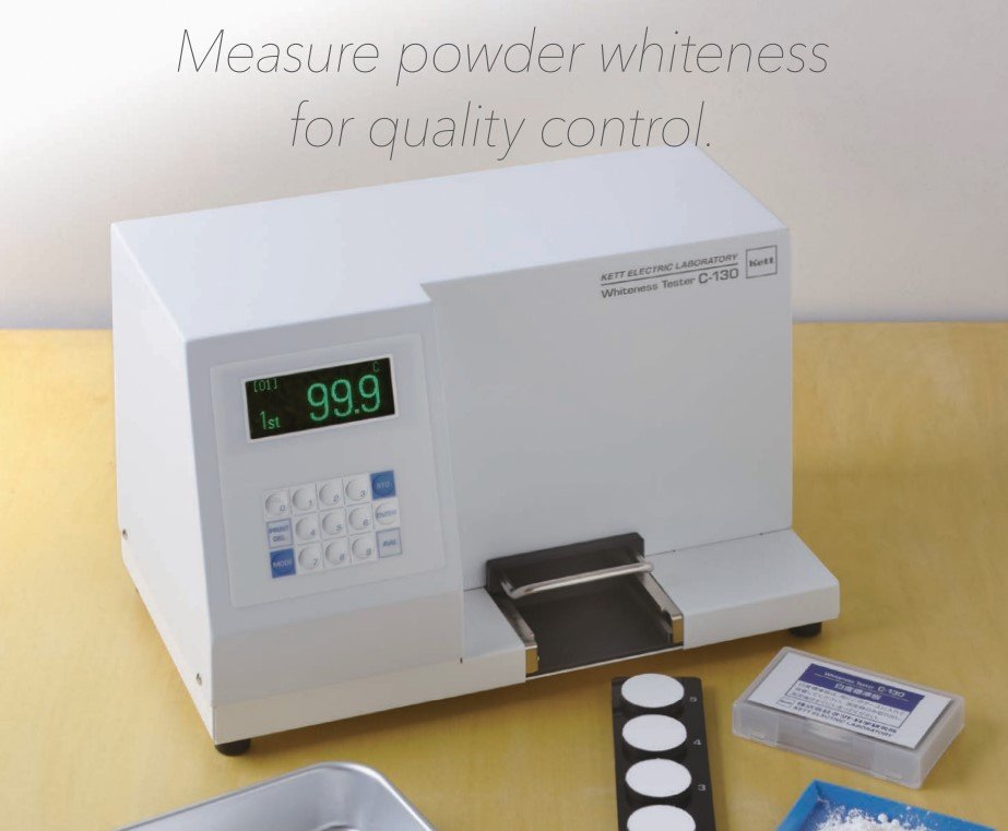Kett C-130 Powder Whiteness Tester This instrument measures the whiteness of various powders, such as starch, wheat, sugar, drugs and cement. It is smaller and lighter than the conventional C-100. The amount of sample required for measurement has been reduced by redesigning the sample case.