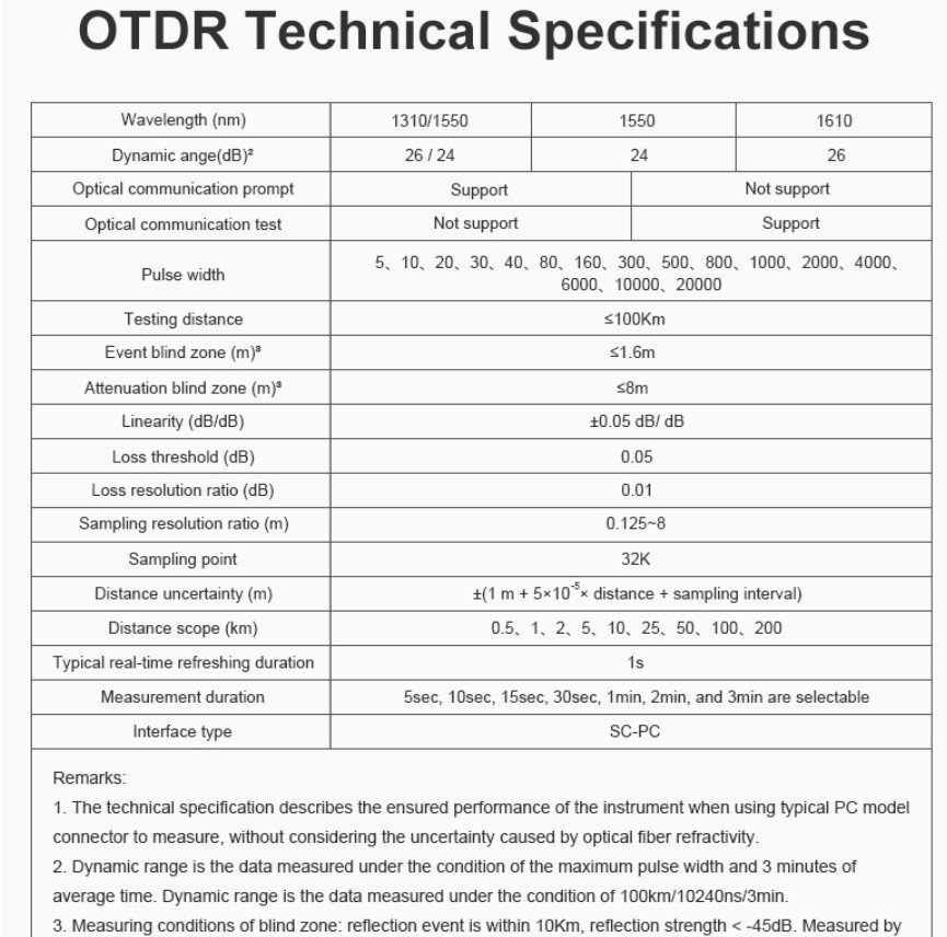- 1310/1550/1610wavelength Optional, 26/24dB Dynamic range Optional*, max test range 100KM*