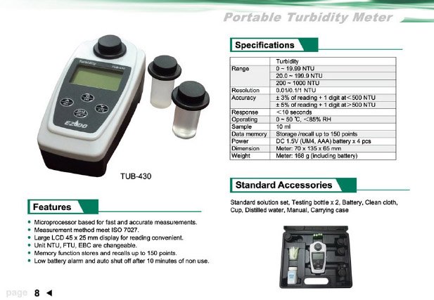 * Range : Auto range, two ranges, 0.00 to 50.00 NTU, 50 to 1,000 NTU.