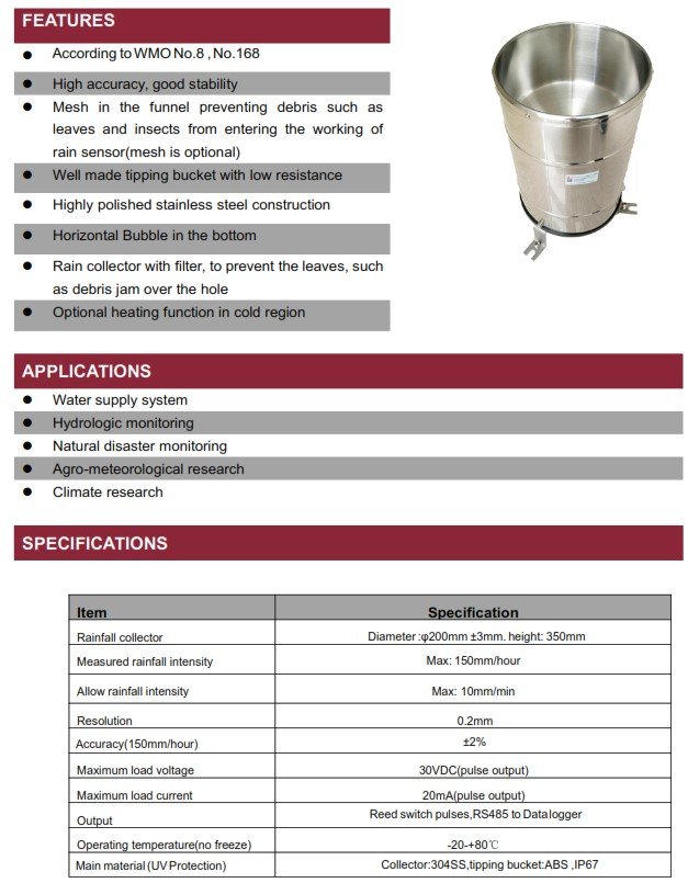 Collector:304SS,tipping bucket:ABS,IP67